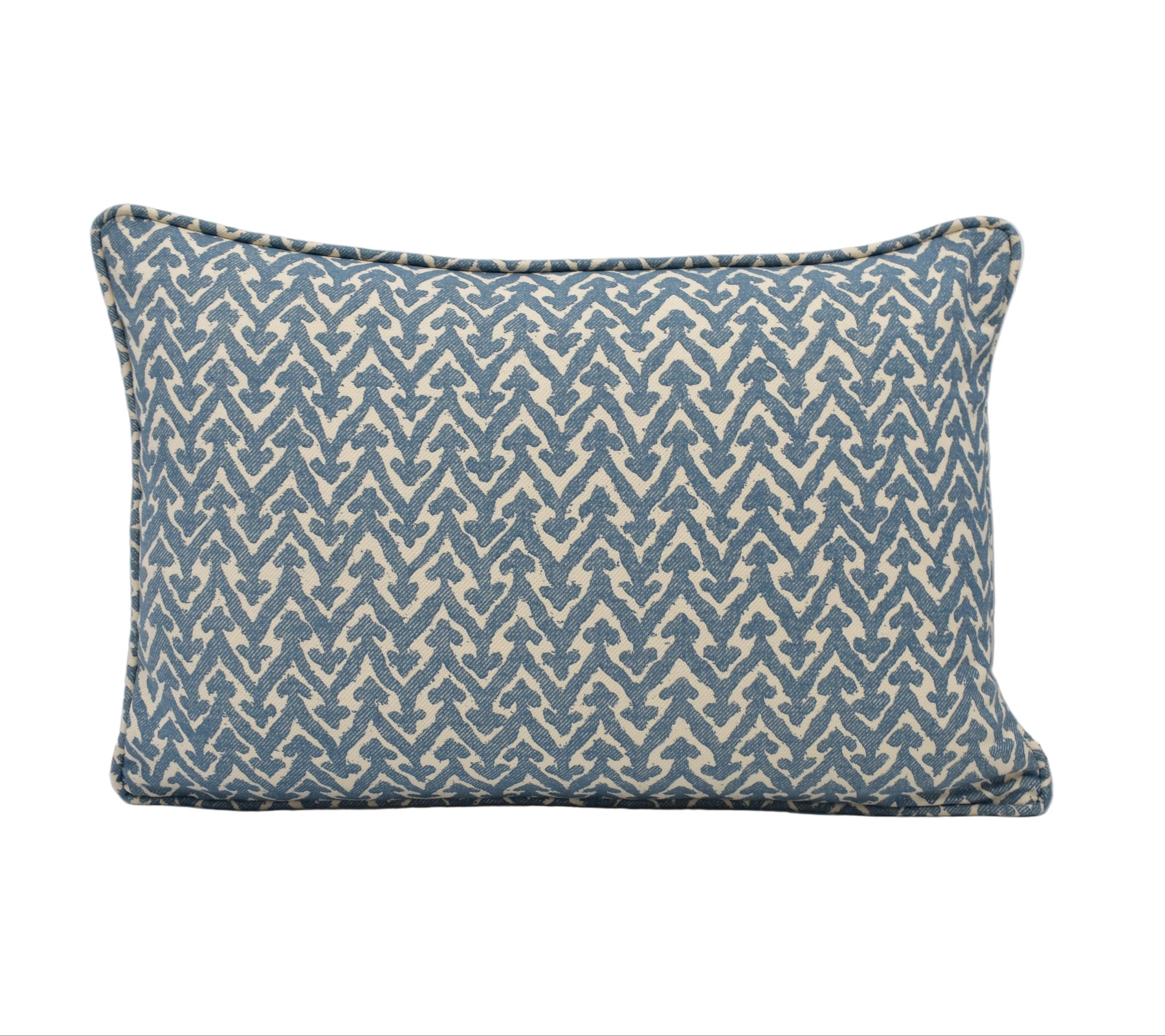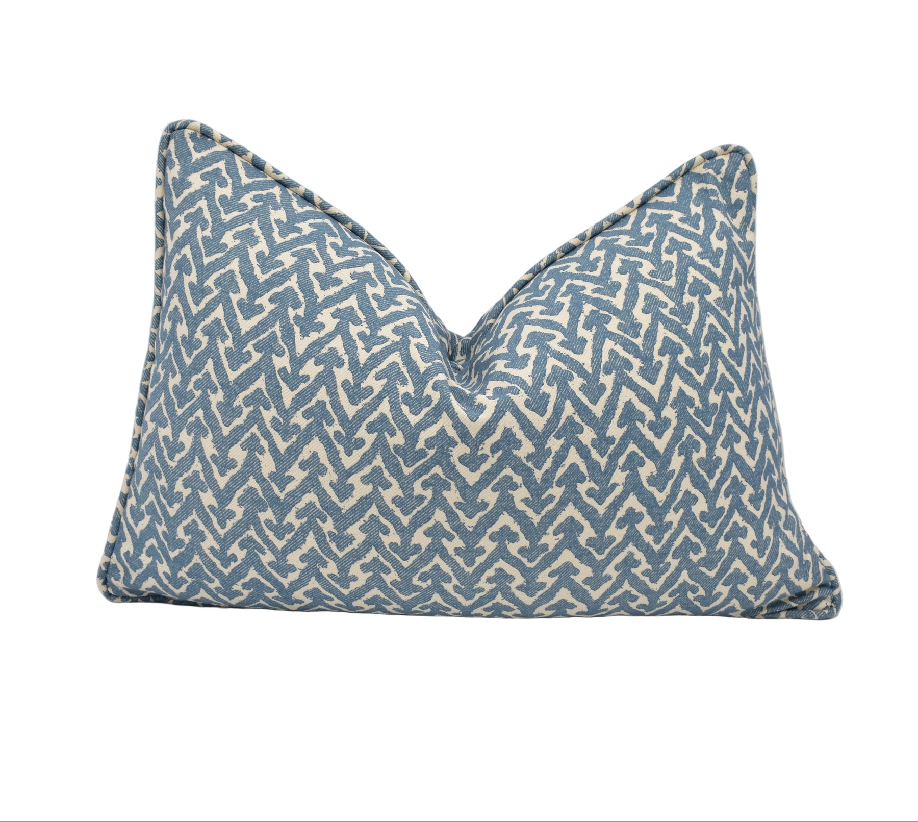 Handmade by May Evelyne, this cushion cover is created using Rabanna 269 by Fermoie, a design inspired by India’s earliest printed cottons. The geometric pattern of zigzags and arrows is brought to life in a soft blue palette, striking the perfect balance between artisanal charm and modern refinement.