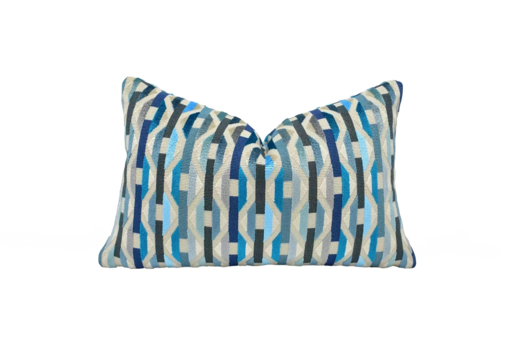Handmade by May Evelyne, this cushion cover features Onetti in Danube from Romo’s vibrant Habanera collection — a striking interlocking geometric cut-and-uncut velvet that brings depth, movement and rich visual texture to interiors. The bold pattern plays with light and shadow across the velvet pile, creating a layered look that feels both contemporary and indulgently tactile.