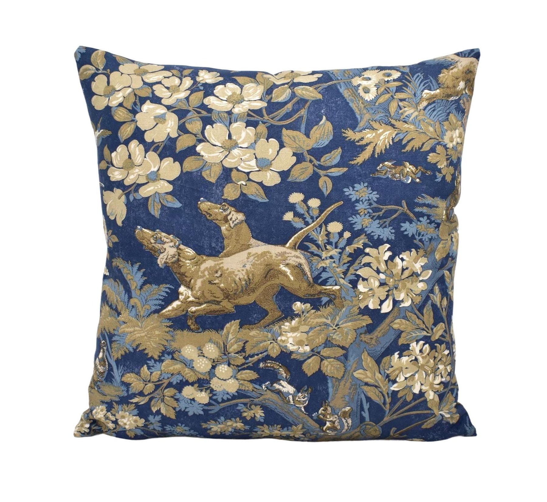 Invite enchanting woodland charm into your home with the Hound Meadow – Indigo cushion cover, artfully handcrafted by May Evelyne. Rendered in fine indigo linen, this design features lovingly drawn pointers, quail, and woodland creatures nestled among intricate foliage—bestowing a tender, vintage pastoral ambiance.