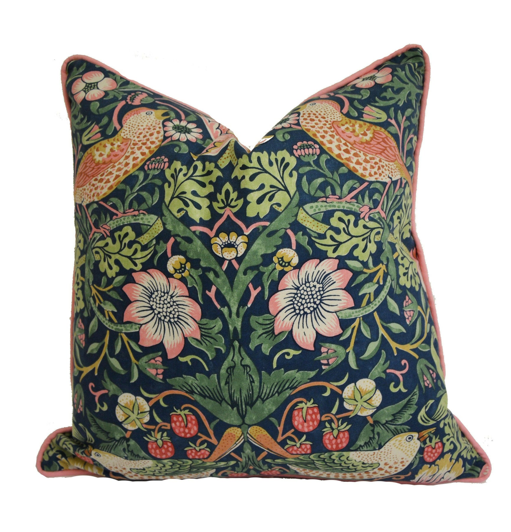 William Morris Strawberry Thief Indigo, Moss and Persian Pink Cushion Cover – Iconic Classic Luxury Pillow