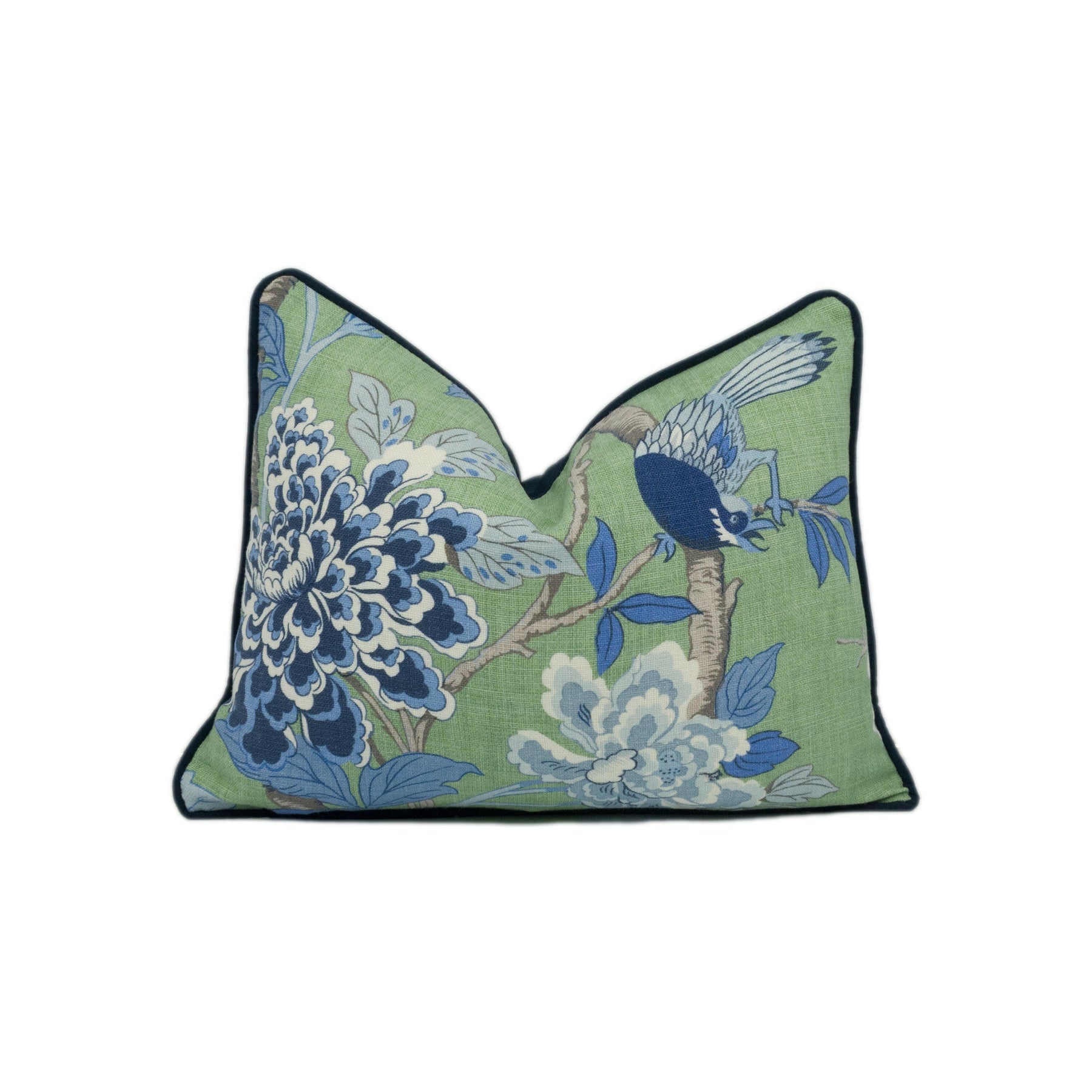 GP & J Baker - Hydrangea Bird - Emerald / Blue - Chinese Inspired Contrast Piped Cushion Cover - Handmade Throw Pillow - Designer Home Décor