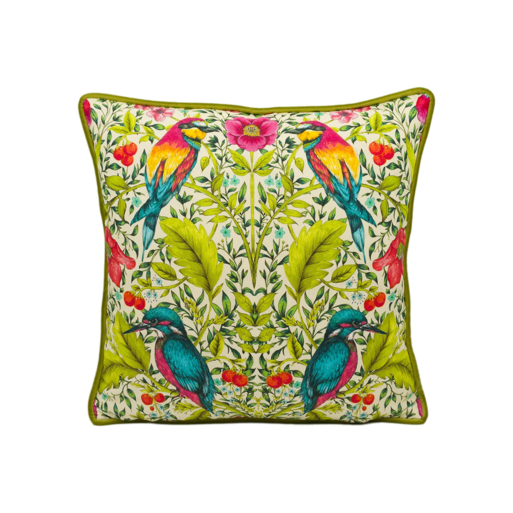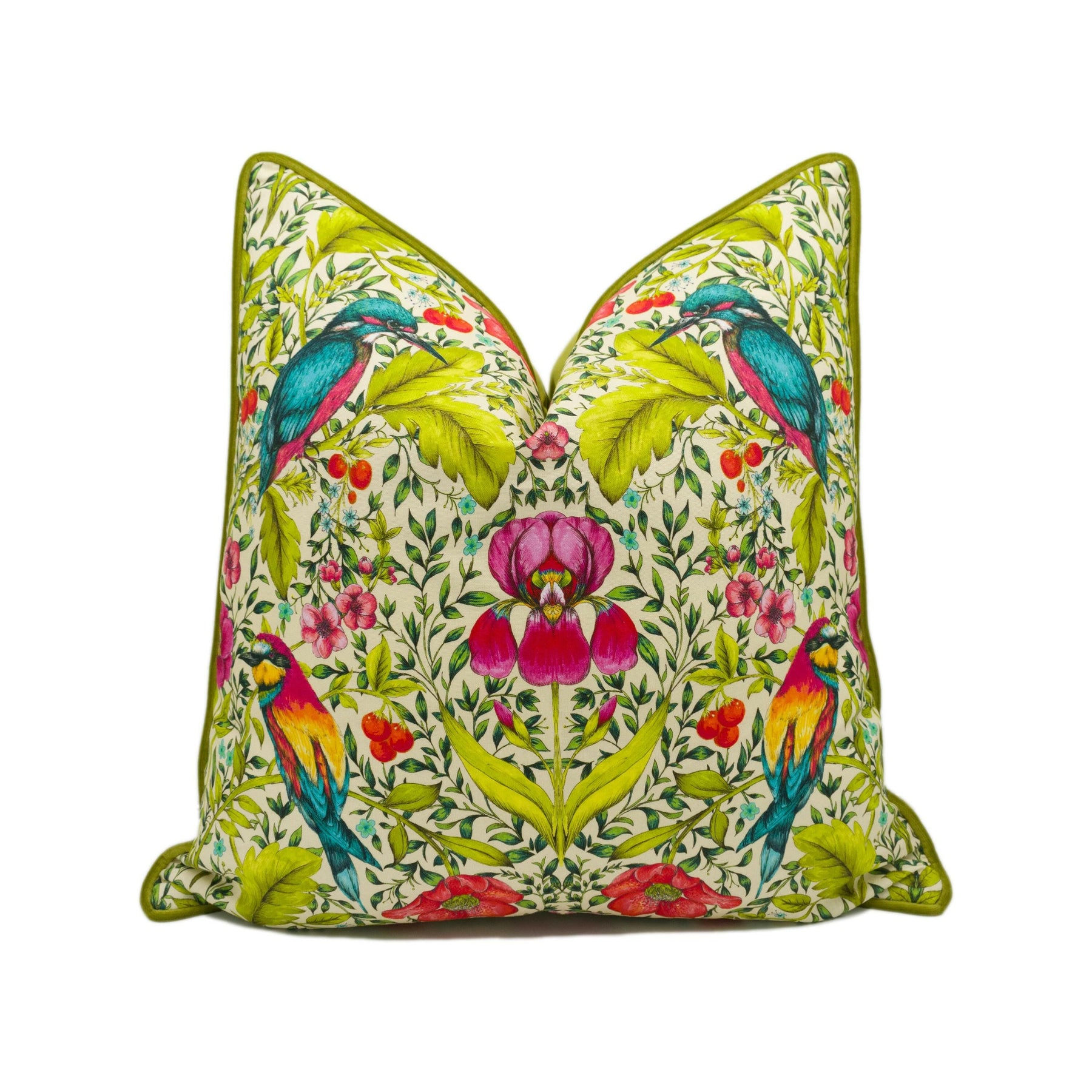 This cushion cover comes with the option of being made with contrast green velvet piping, as well as the option to be made with double-sided pattern or with a plain complementary back.