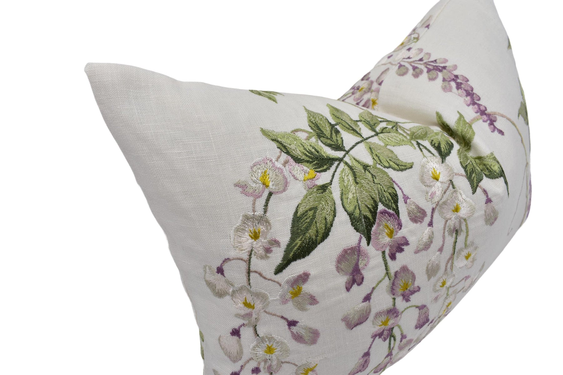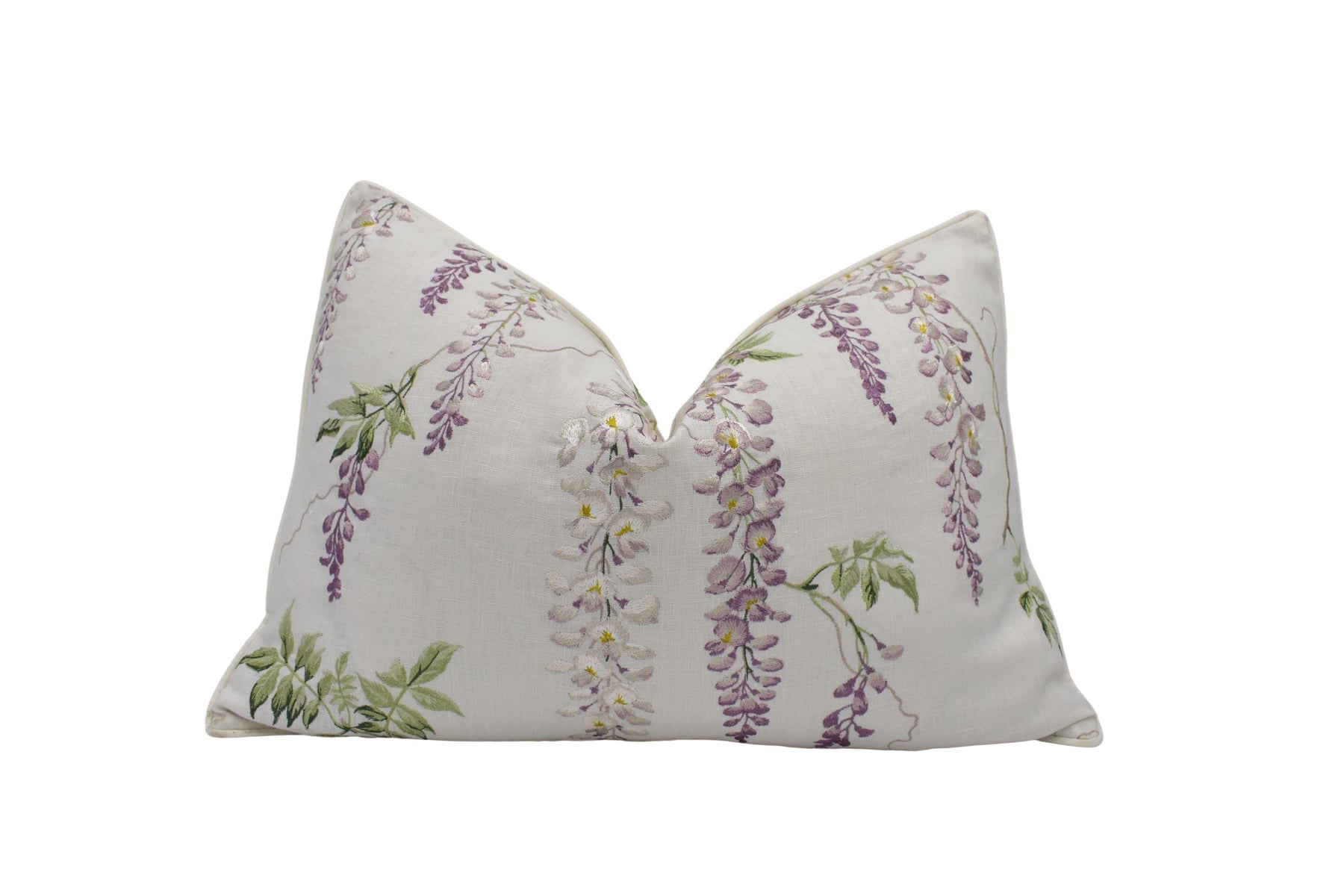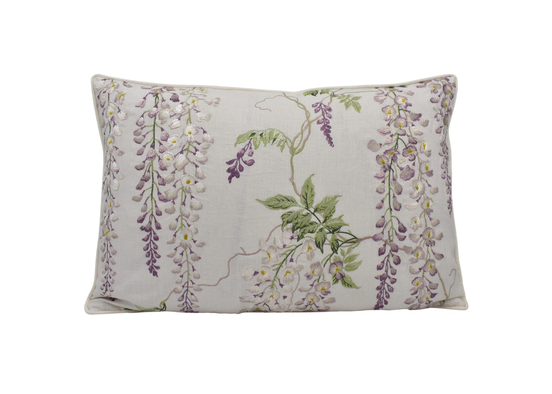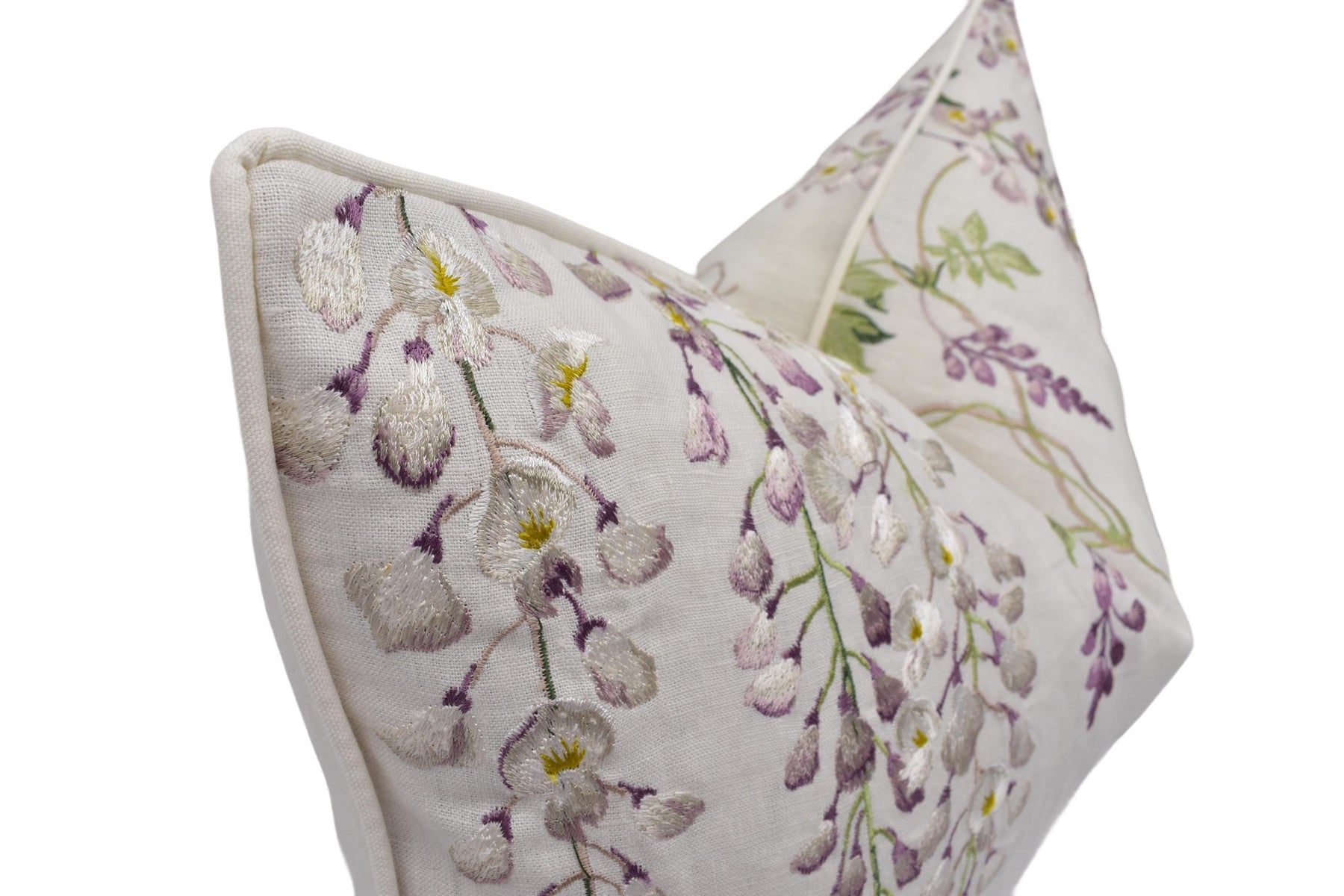 Infuse your décor with serene elegance using the Seraphina – Lilac & Leaf cushion cover by Mayevelyne. This beautifully embroidered fabric depicts delicate wisteria blossoms and foliage in soft lilac and sage tones, lovingly stitched onto a tactile linen base. Each floral motif is subtly raised, giving a handcrafted, painterly charm that suits romantic bedrooms, elegant sitting rooms, or refined garden rooms.