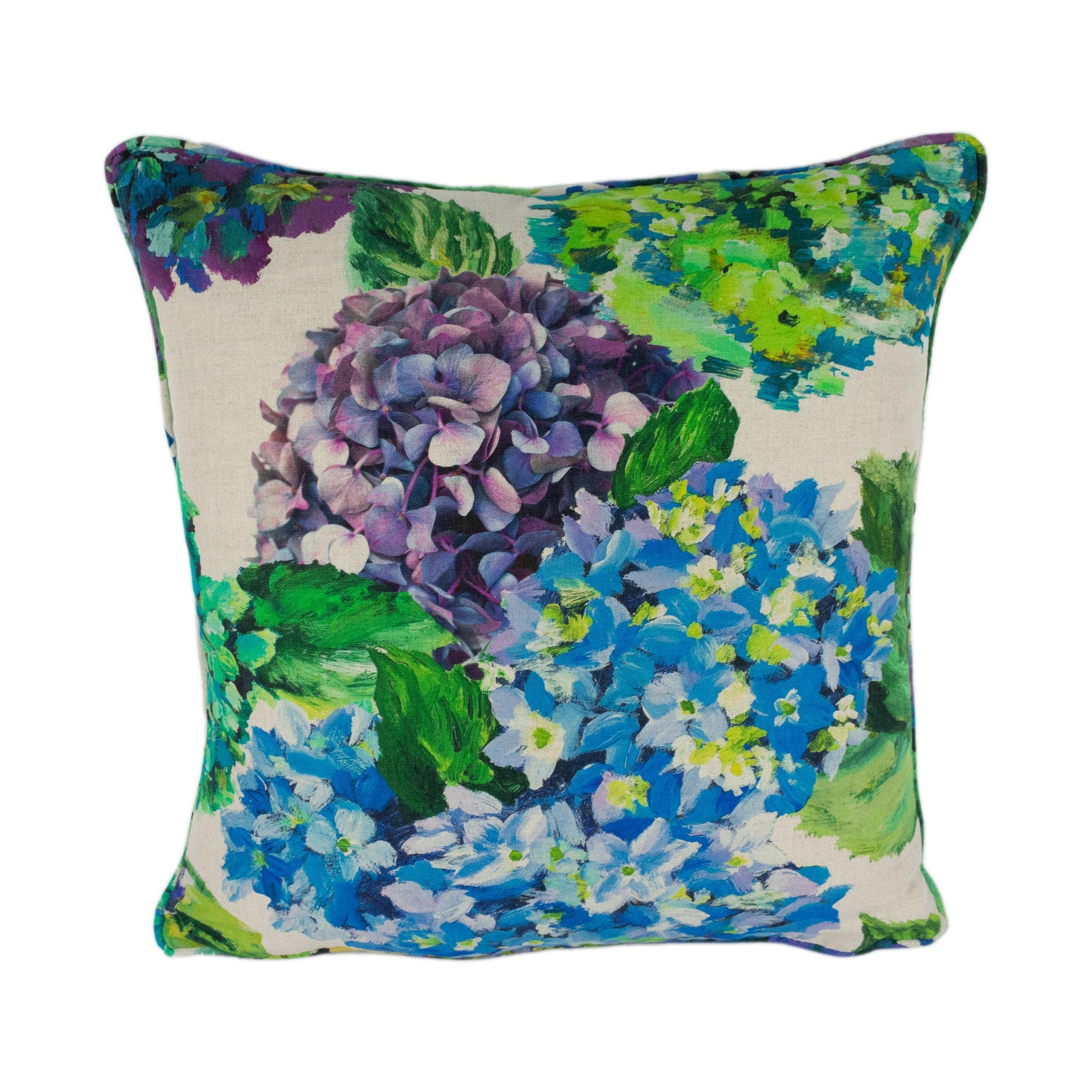 This cushion cover is self-piped, and comes with the option of double sided or with a plain complementary backing.