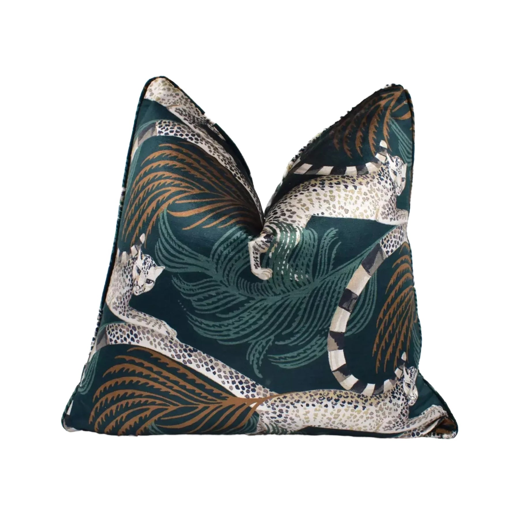 Handmade by May Evelyne, this cushion cover is cut from Delilah Velvet in Tuscan Teal, a printed velvet from the Temperley London x Romo collection that feels delightfully expressive and artistic. Mystical leopards with lemur-like tails bound across the plush surface, leaving soft, feathery plumes in their wake — giving this piece a whimsical, narrative-driven feel that adds personality to any space.
