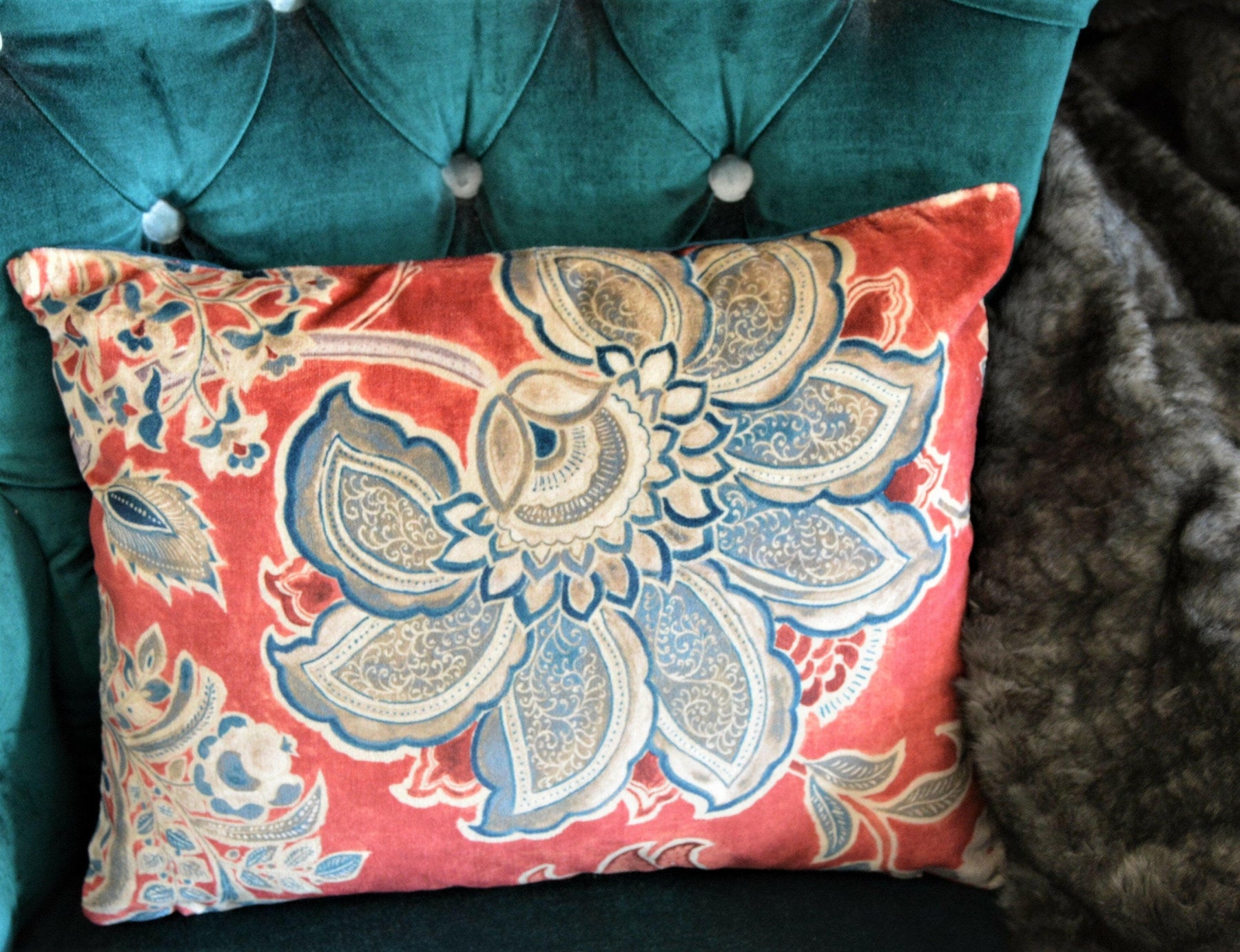 Sanderson - Shalimar - Ruby / Teal - Designer Cushion Cover Throw Pillow - Batik Vintage Floral Print - Luxury Super Soft Velvet
