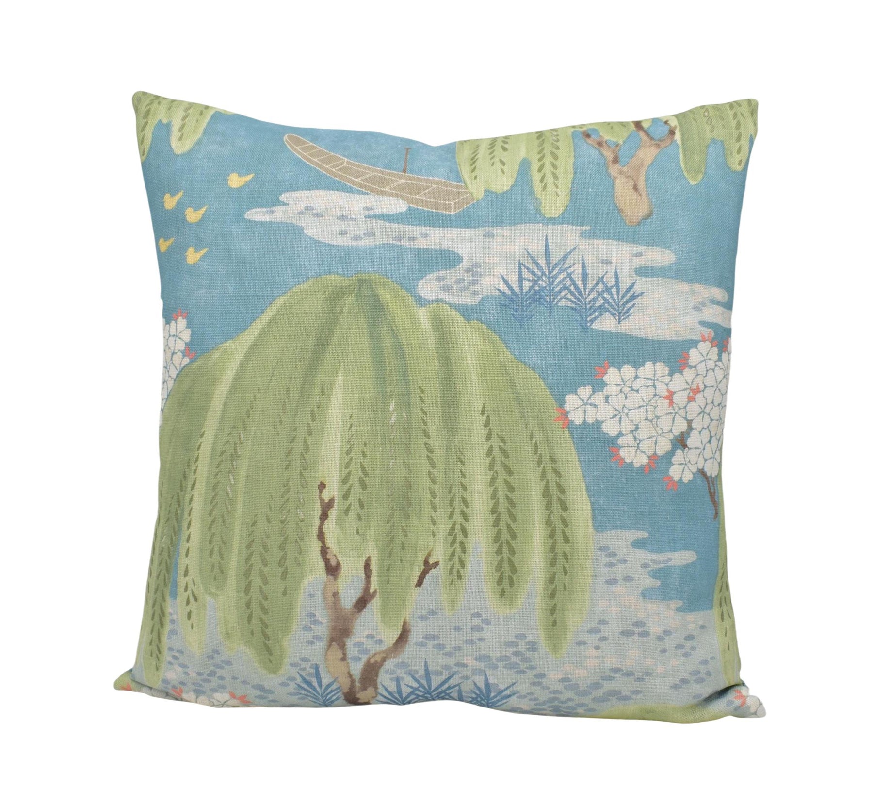 Bring serenity and painterly beauty to your space with this Willow Tree – Turquoise cushion cover, made by Mayevelyne using fabric from Anna French’s Willow Tree collection. Inspired by stylised botanical murals, this elegant design features cascading willow branches and flowering trees in cool turquoise and fresh green tones.
