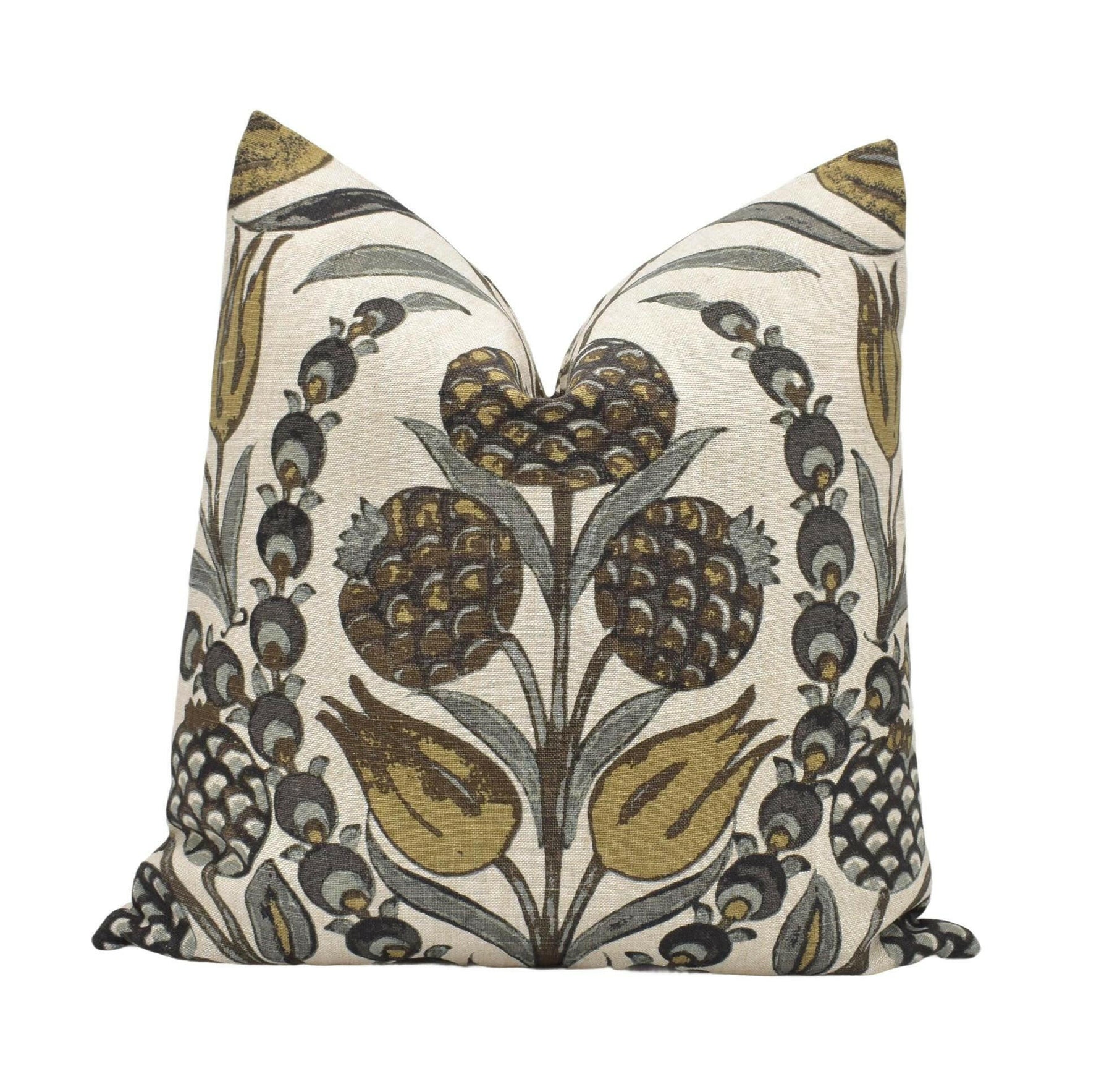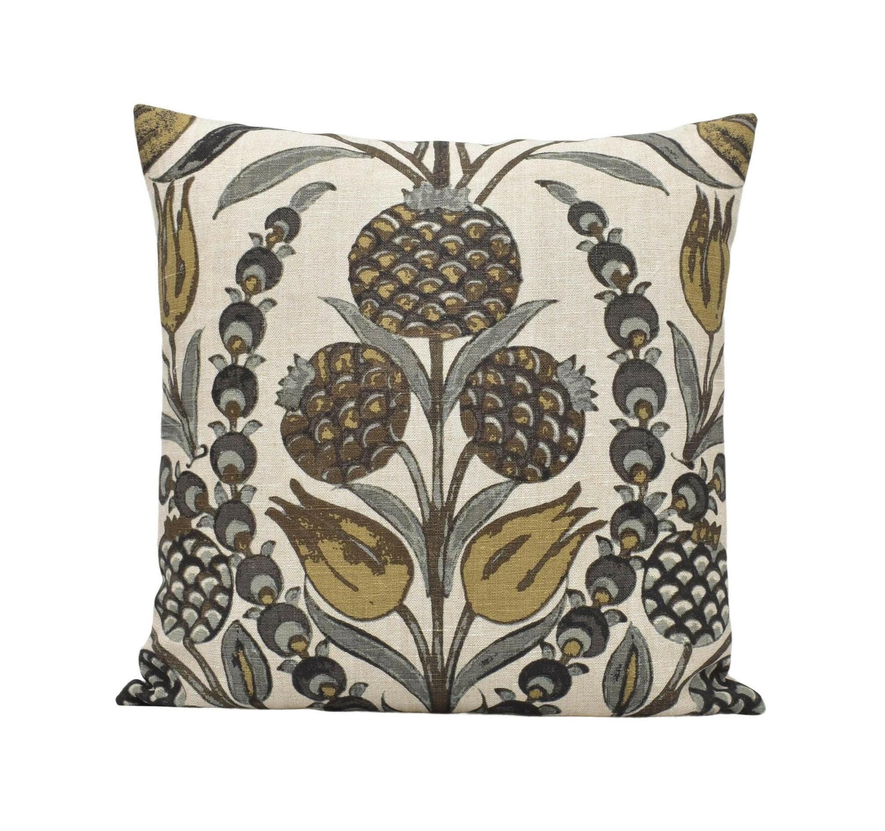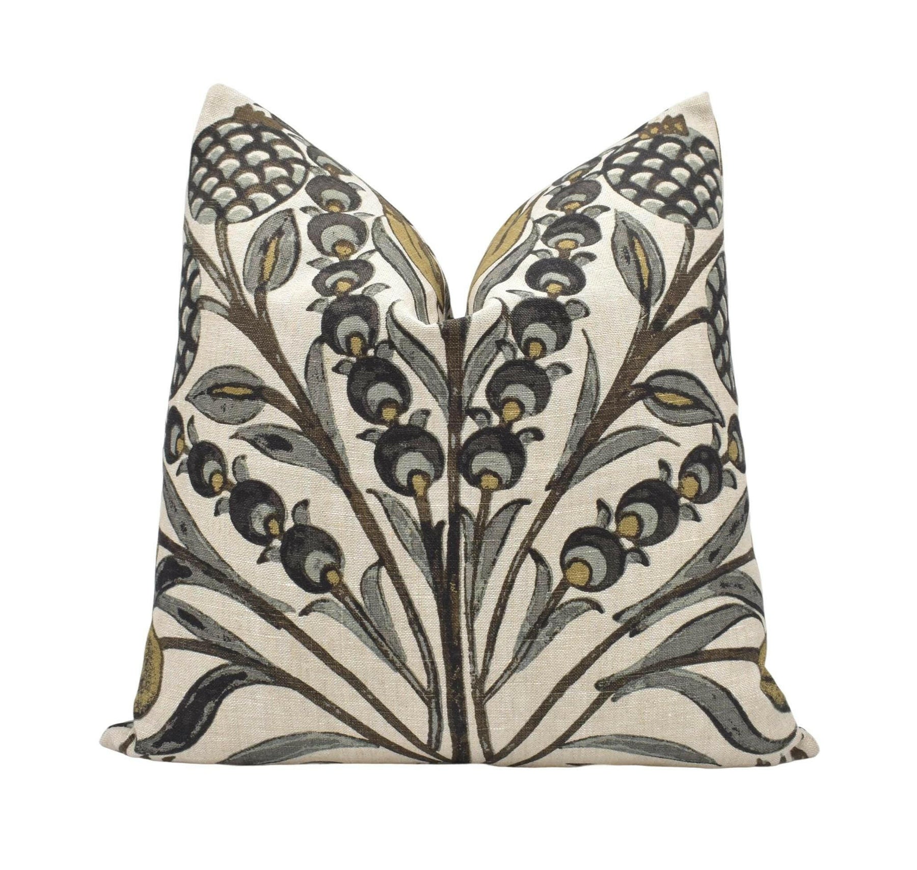 Handmade by May Evelyne, this cushion cover showcases Thibaut’s Corneila design in an elegant Grey and Gold palette. Inspired by the look of Moroccan tile patterns, the print brings together primitive pomegranates and tulips in a rich, artful arrangement that feels both decorative and grounded. Hand printed in India, the fabric carries an artisan-made character that looks beautiful in interiors with thoughtful detail and global flair.