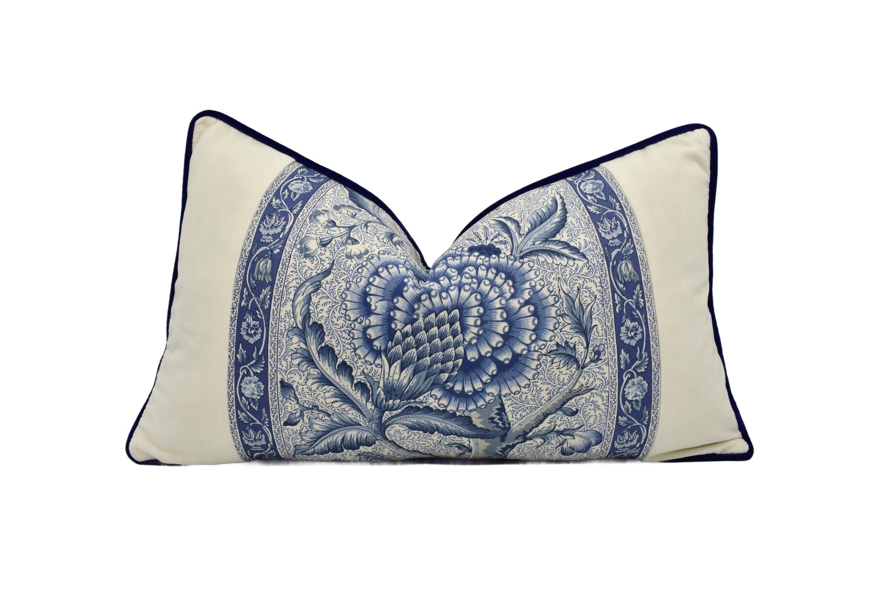 Inspired by the elegance of the French Riviera, this striking panel cushion cover is crafted using Le Grand Corail Camaïeux Rayure by Pierre Frey. A bold vertical stripe in coastal blues runs down the centre, framed by panels of soft white velvet that add a rich, tailored finish. For a bolder accent, an optional blue velvet piping enhances the outline, giving the cushion added structure and visual depth.